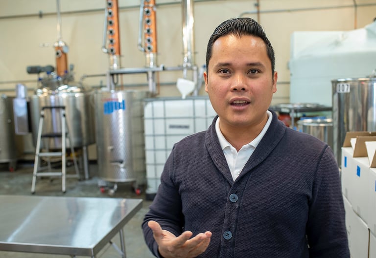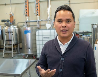 Though born in Vietnam, distillery founder Binh Đào grew up in California. He left as a child on a boat piloted by his father, carrying 58 people, mostly family. They were washed ashore in a typhoon, taking refuge in an abandoned temple on Hainan Island. The family bounced between refugee camps in Hong Kong for seven years, deported back to Vietnam, before eventually getting refugee status. He landed in eight grade in Sacramento, speaking no English, and worked his way up to not only being accept to the University of California Davis but also earning a Ph.D. there. Professor Dao teaches chemistry at Sacramento city College.