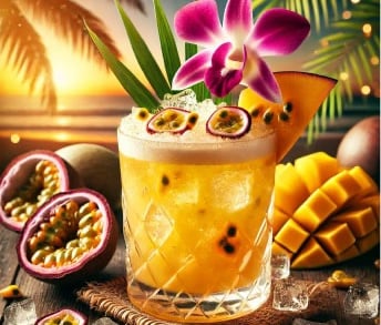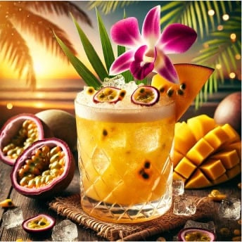 Garnish with a fresh mango slice, passion fruit seeds, and an edible orchid.