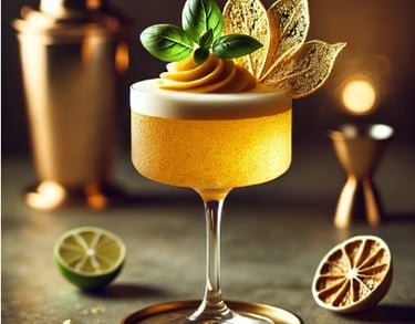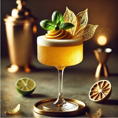 Garnish with edible gold flakes, a Thai basil sprig, and a dehydrated lime wheel.