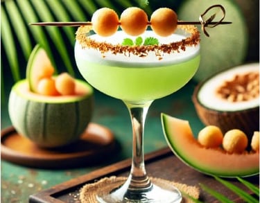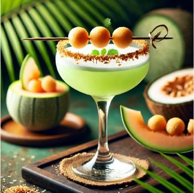 Garnish with toasted coconut flakes and a fresh melon ball skewer.
