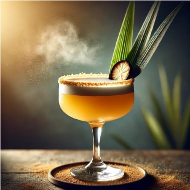 Garnish with toasted coconut rim, pandan leaf, jasmine mist
